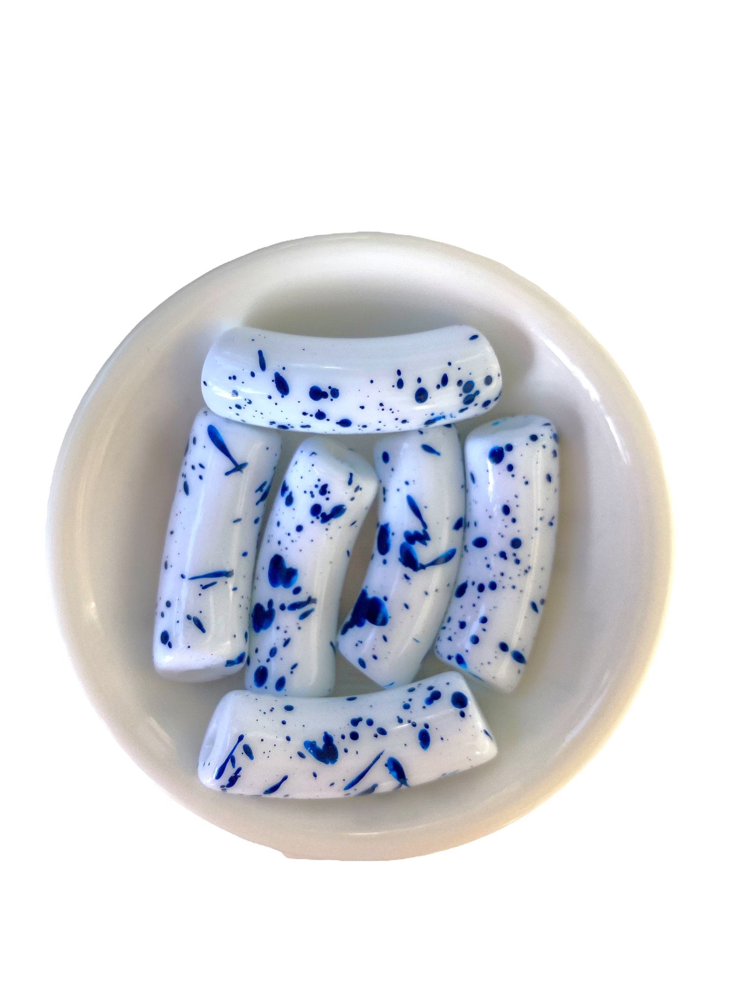 12mm White w/ Blue Graffiti Paint Splatter Bead Tube Beads, Game Day Beads Curved Tube Beads, Resin, Lucite Bracelet Bangle Acrylic Tube