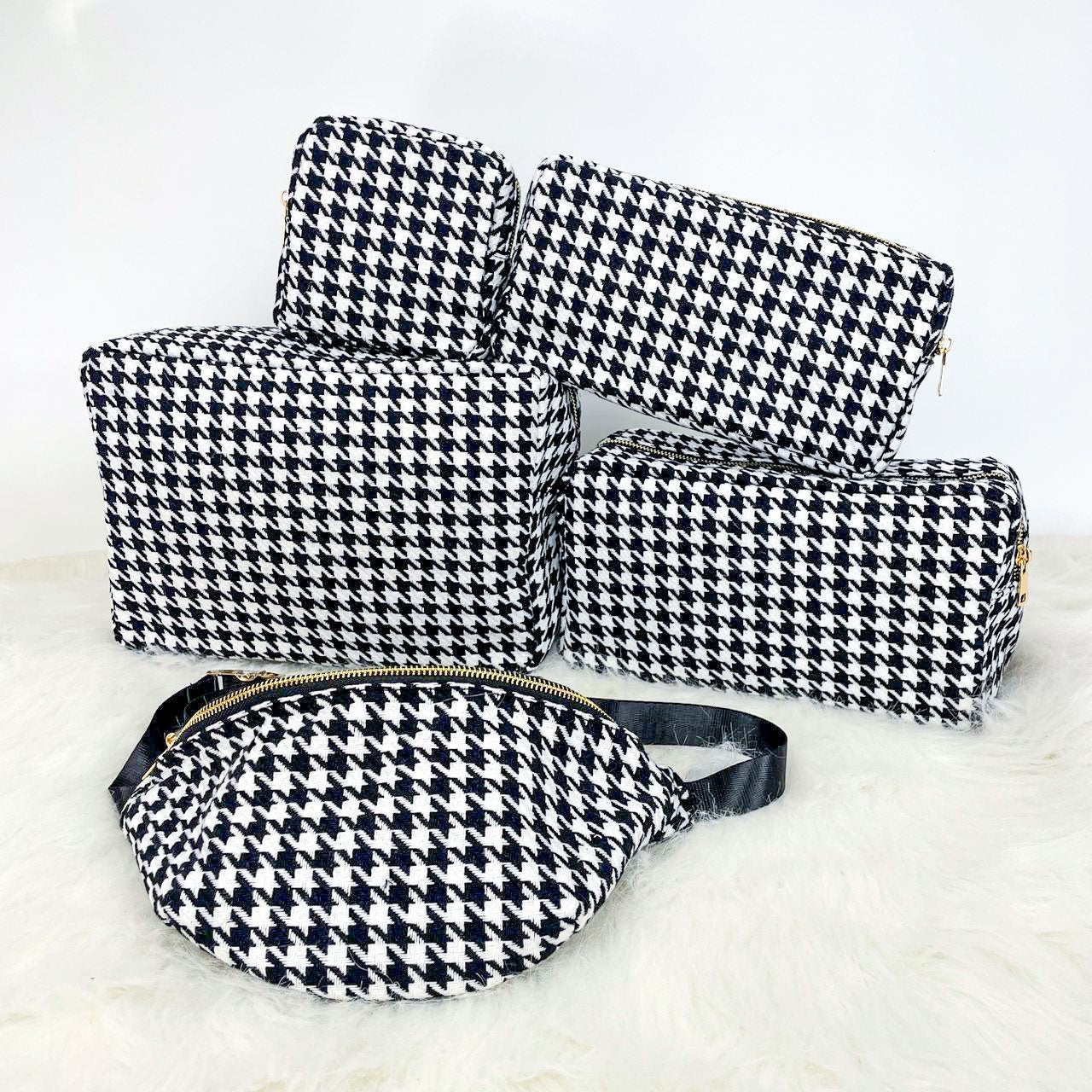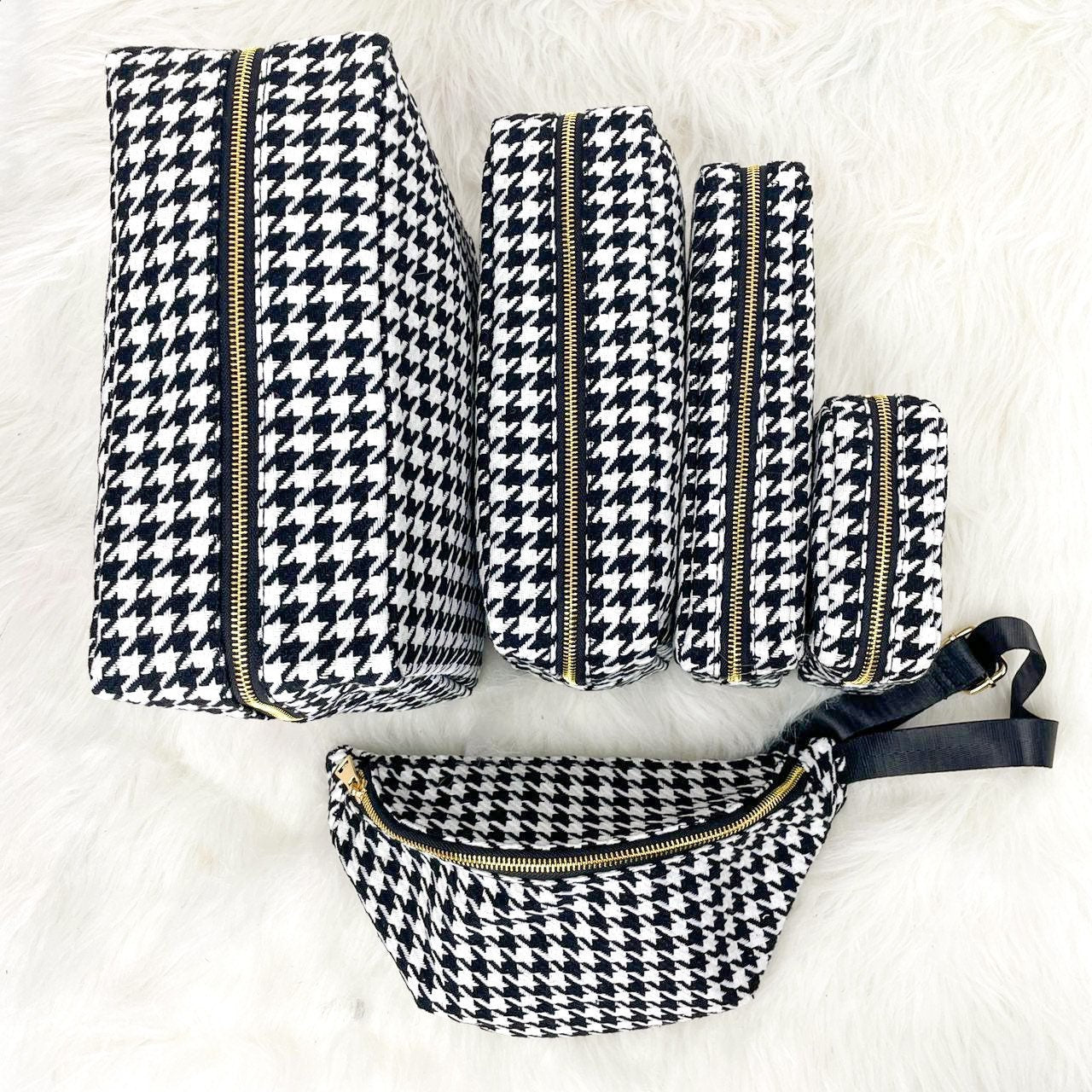 Our houndstooth bags are sold in 4 size cosmetic bags or a fanny pack . They are the perfect way to stay organized .