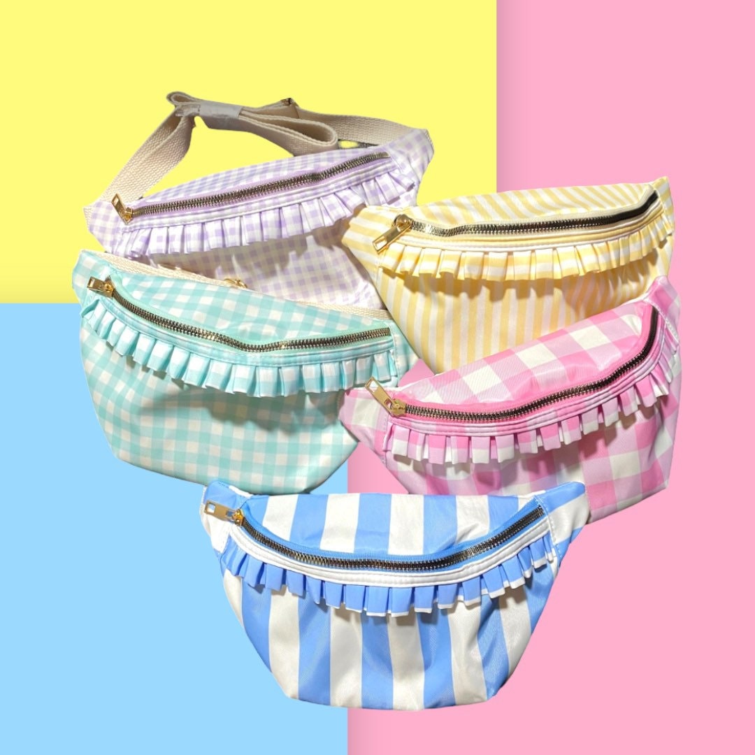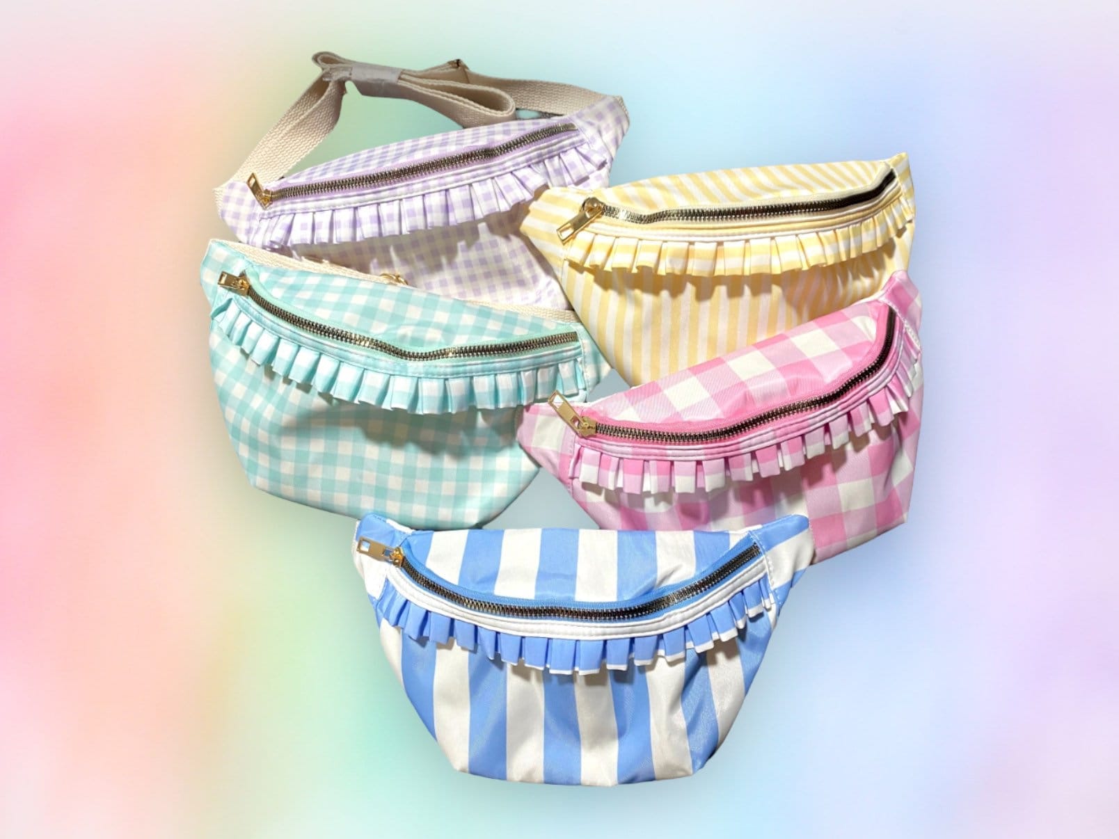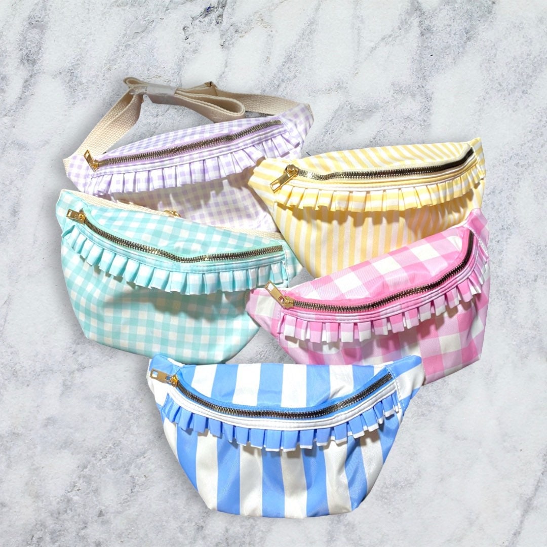 Ruffle Fanny Pack- Cosmetic Bag - DIY Customizable With Glitter Varsity Letter Initial Patch Makeup Bag- Ruffle striped bag-Easter gift