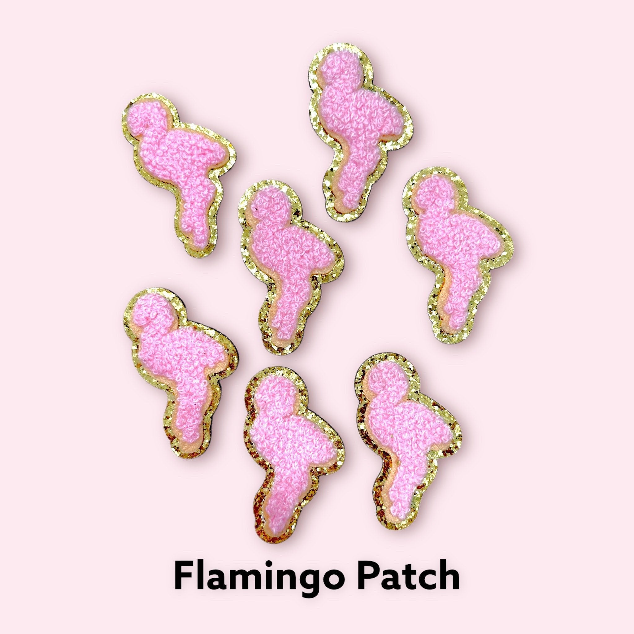 Pink Flamingo -Self Adhesive Patch- Chenille DIY Patch with Gold Glitter Trim- Varsity Letter- Perfect for Nylon Pouches & Clothes