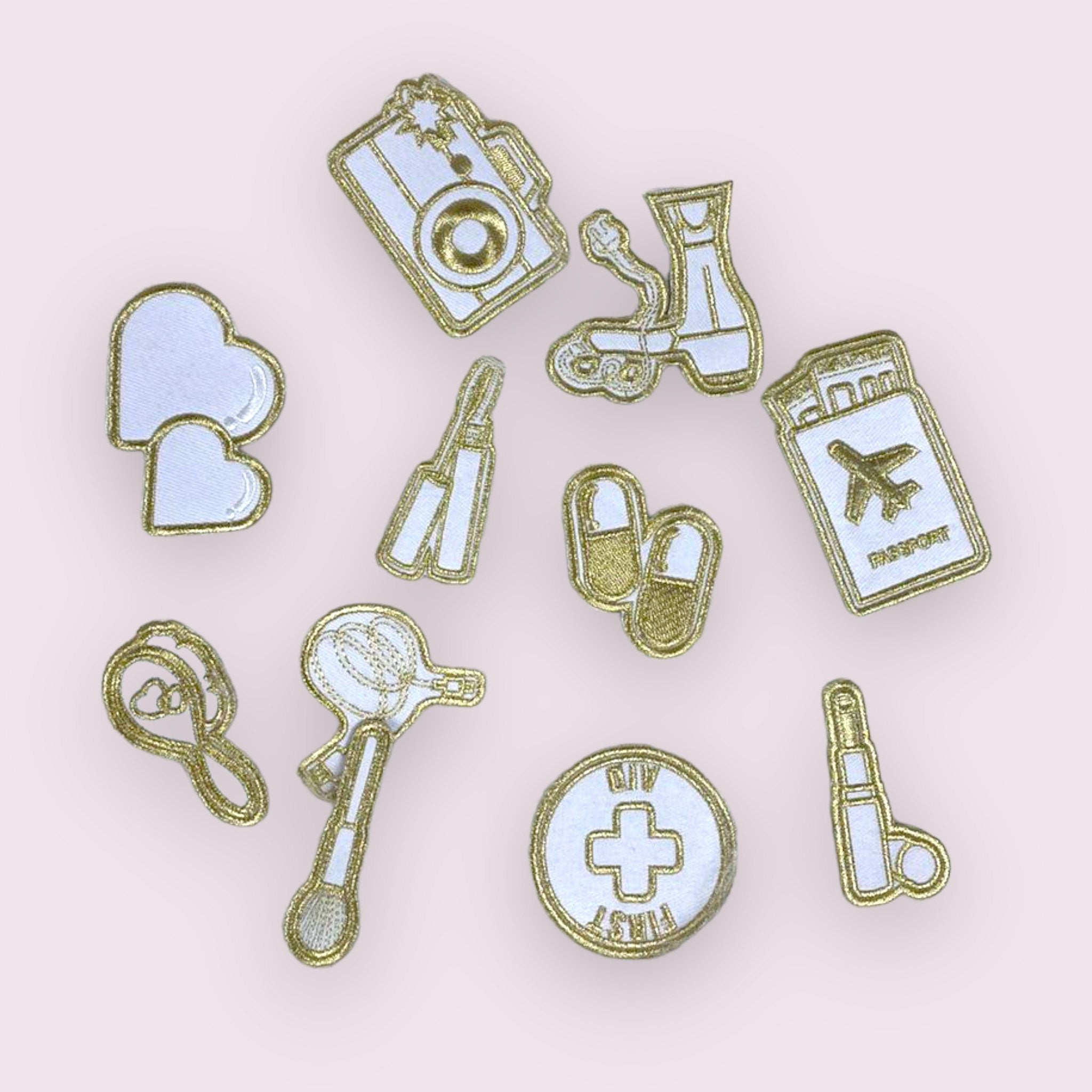 White & Gold Embroidery Patch - First Aid - Hair dryer - Travel - Airplanes- Makeup - Glam DIY Gold Glitter Nylon Pouch cosmetic Bag DIY