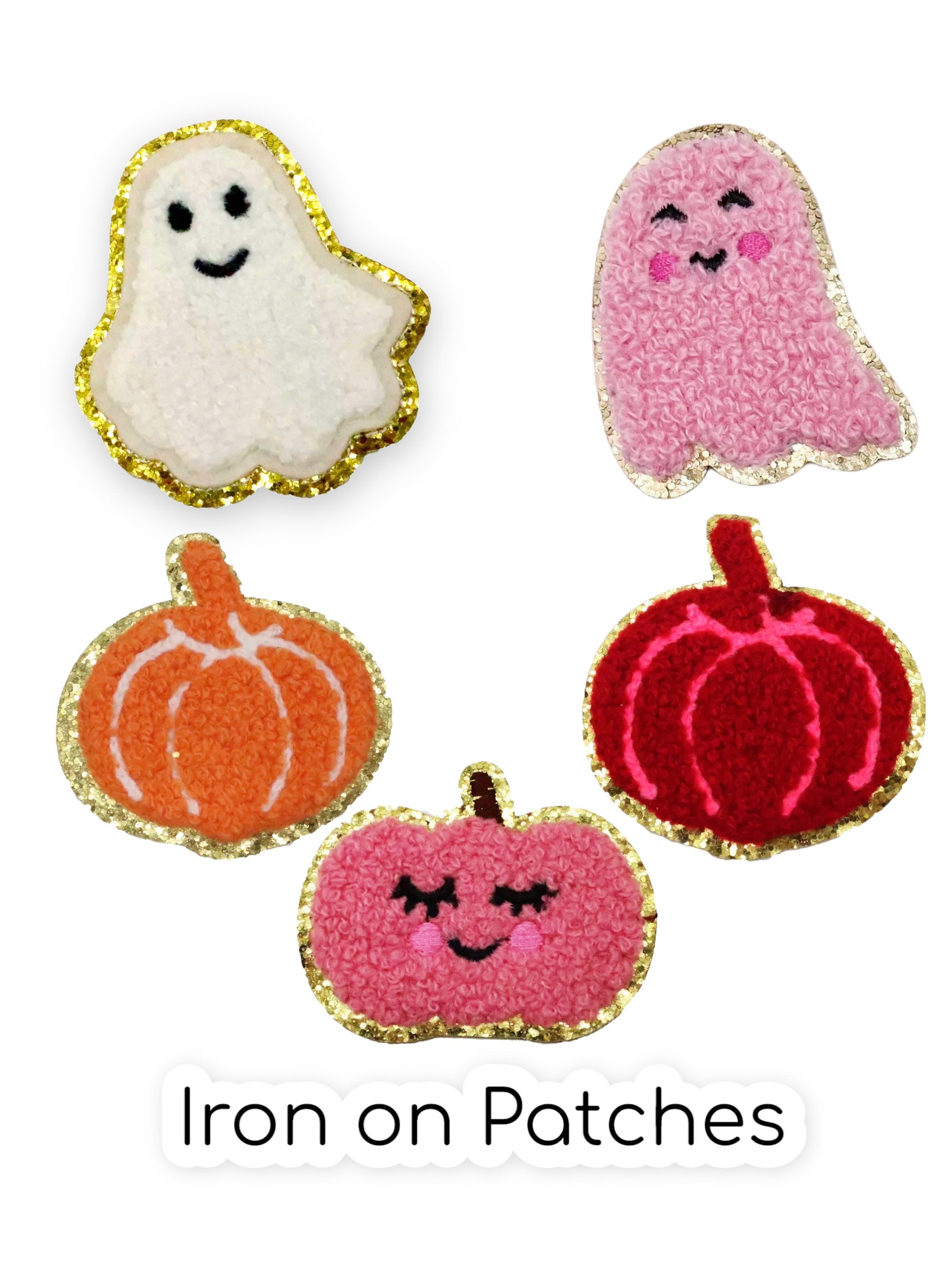 Pumpkin Ghost - Iron On Patch - Halloween Pumpkin & Ghost Chenille Patch Fall Patch- Pink Pumpkin, Cutest Pumpkin Patch, Gold Glitter