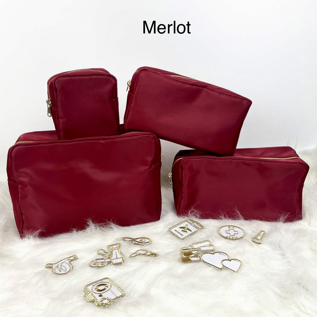 Merlot Red - Fall Nylon Cosmetic Bag - DIY Customizable Glitter Varsity Letter Initial Patches Makeup Bag- Nylon Pouch - Bridesmaid gift