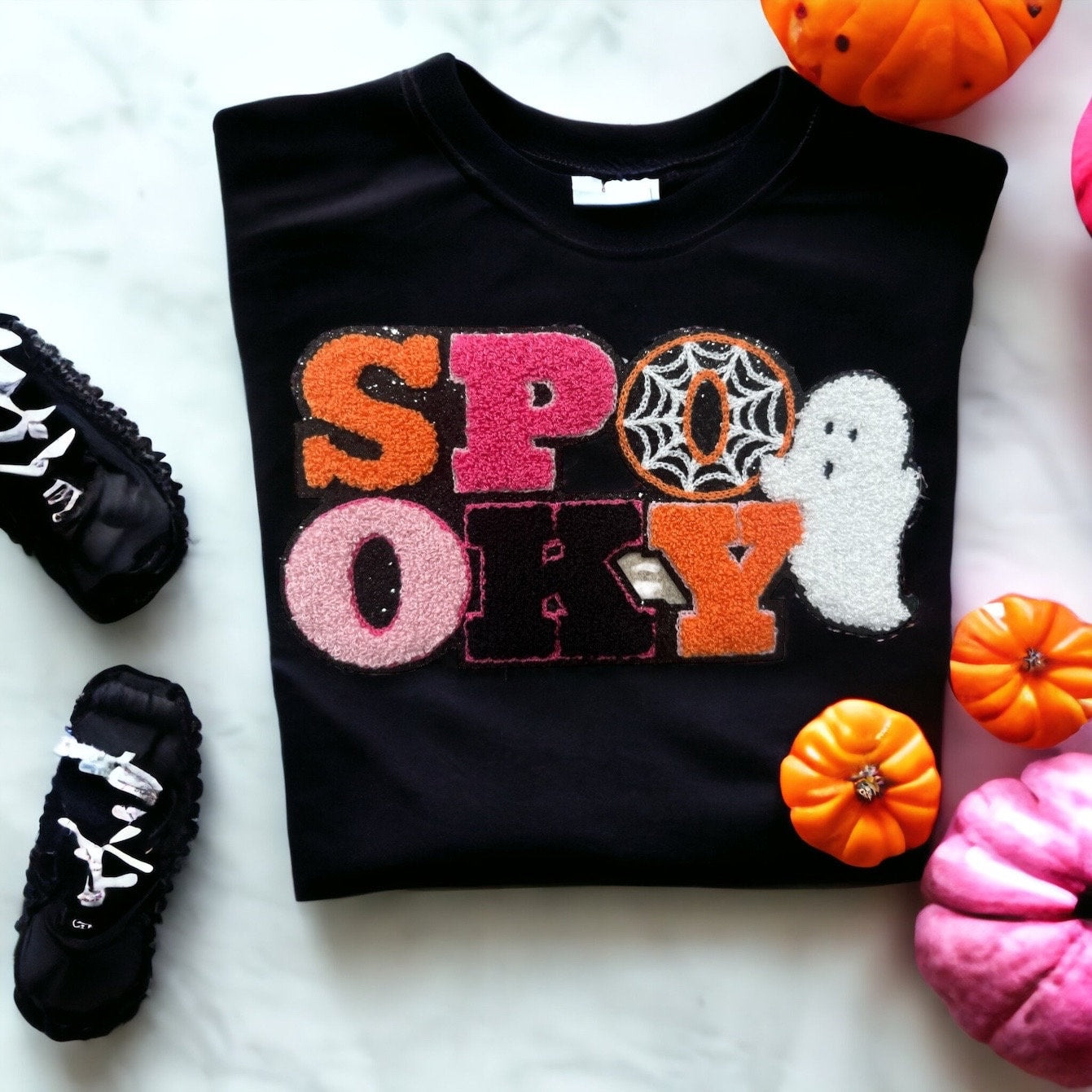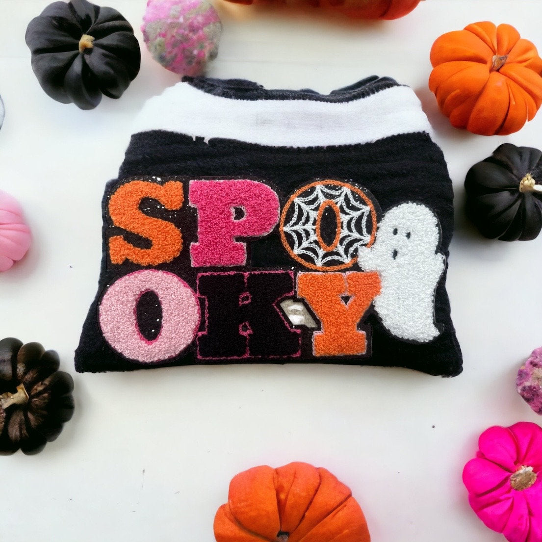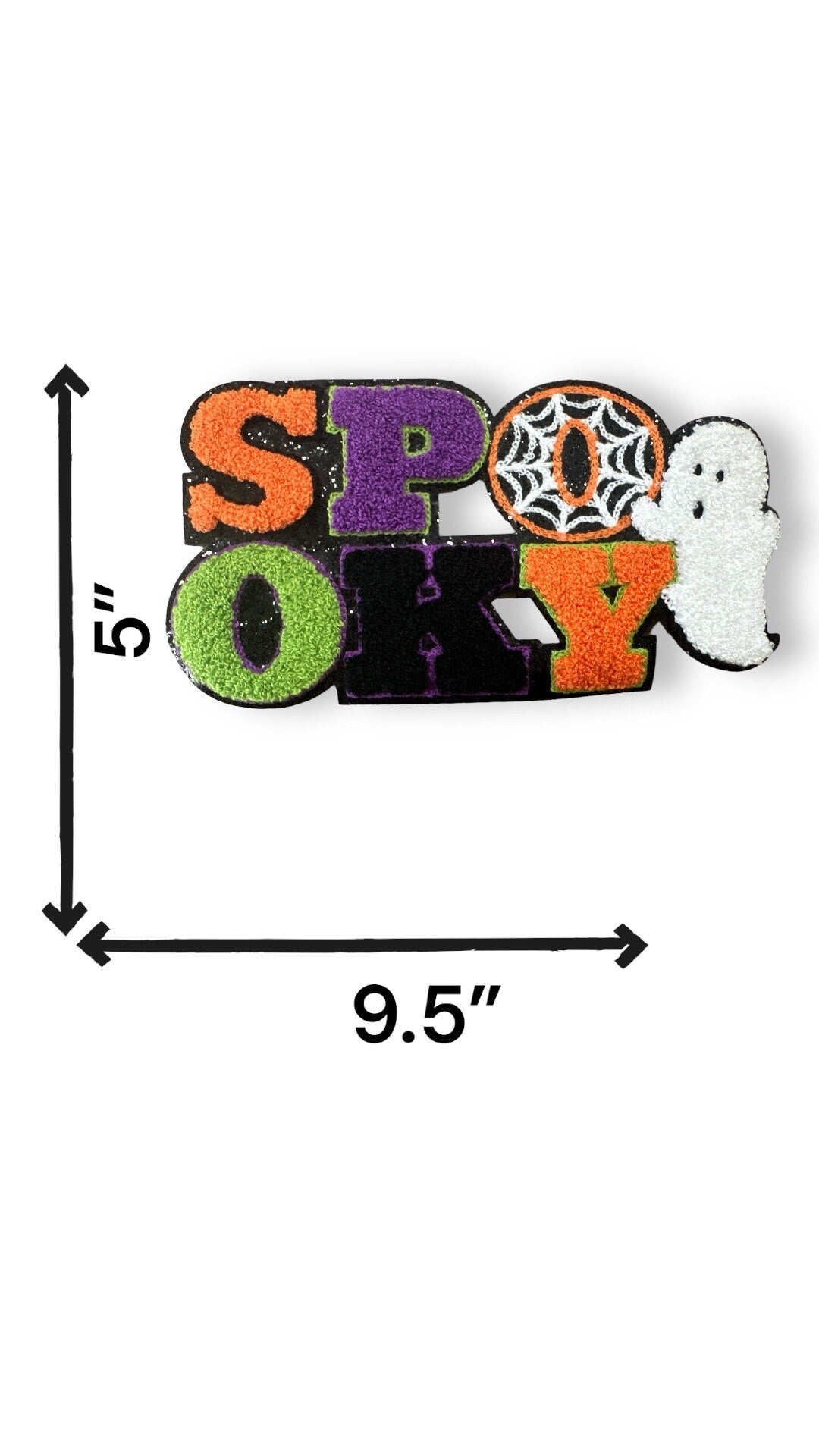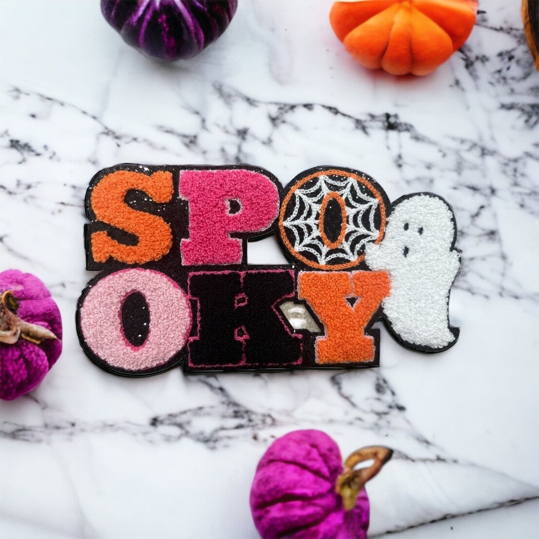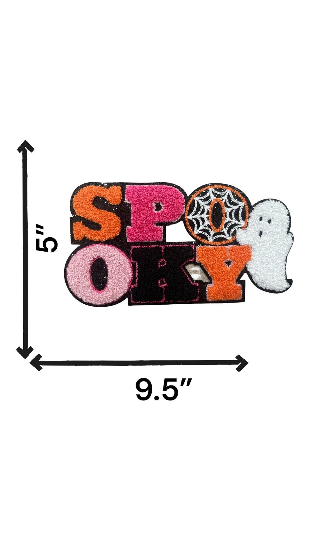 Spooky - Iron On Patch - Halloween cute Ghost Chenille Patch Fall Patch- Pink Pumpkin, Patch, Gold Glitter 9.5”x5”