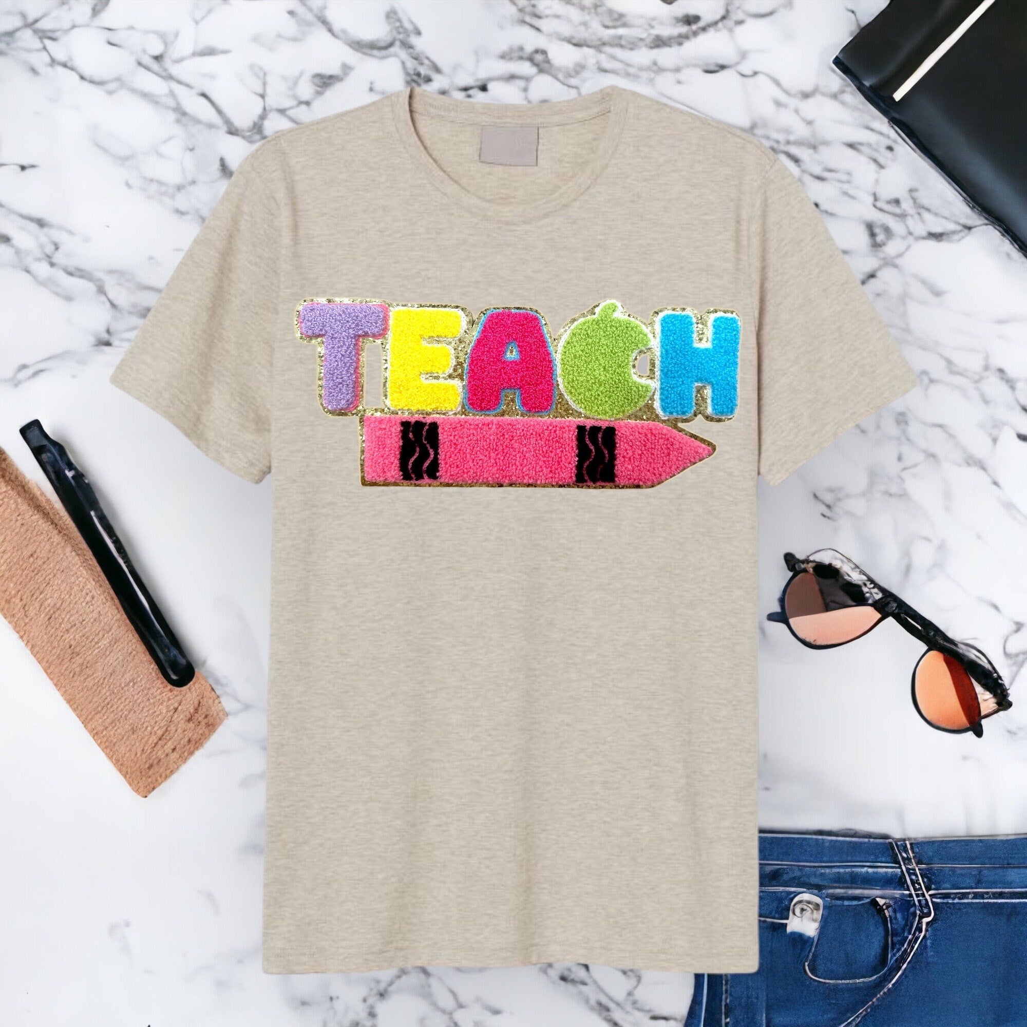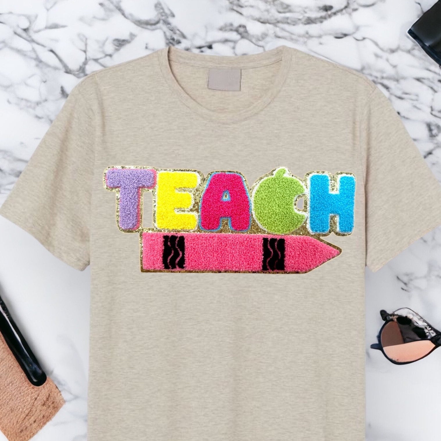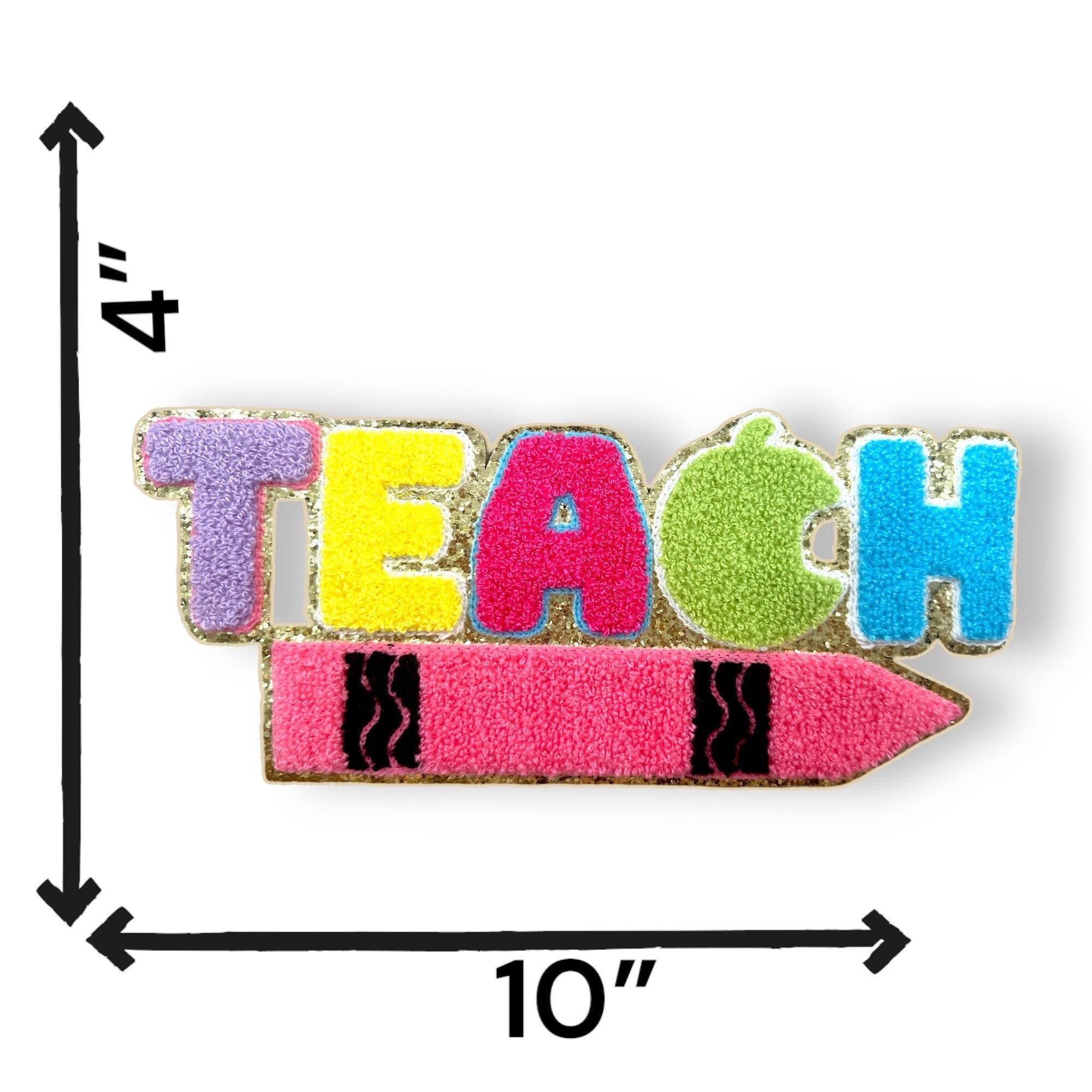 Teach Patch - Iron On Glitter Chenille Patch, chenille letters, teacher , homeschool mom sweatshirt, Teacher sweatshirt 10” x 4”