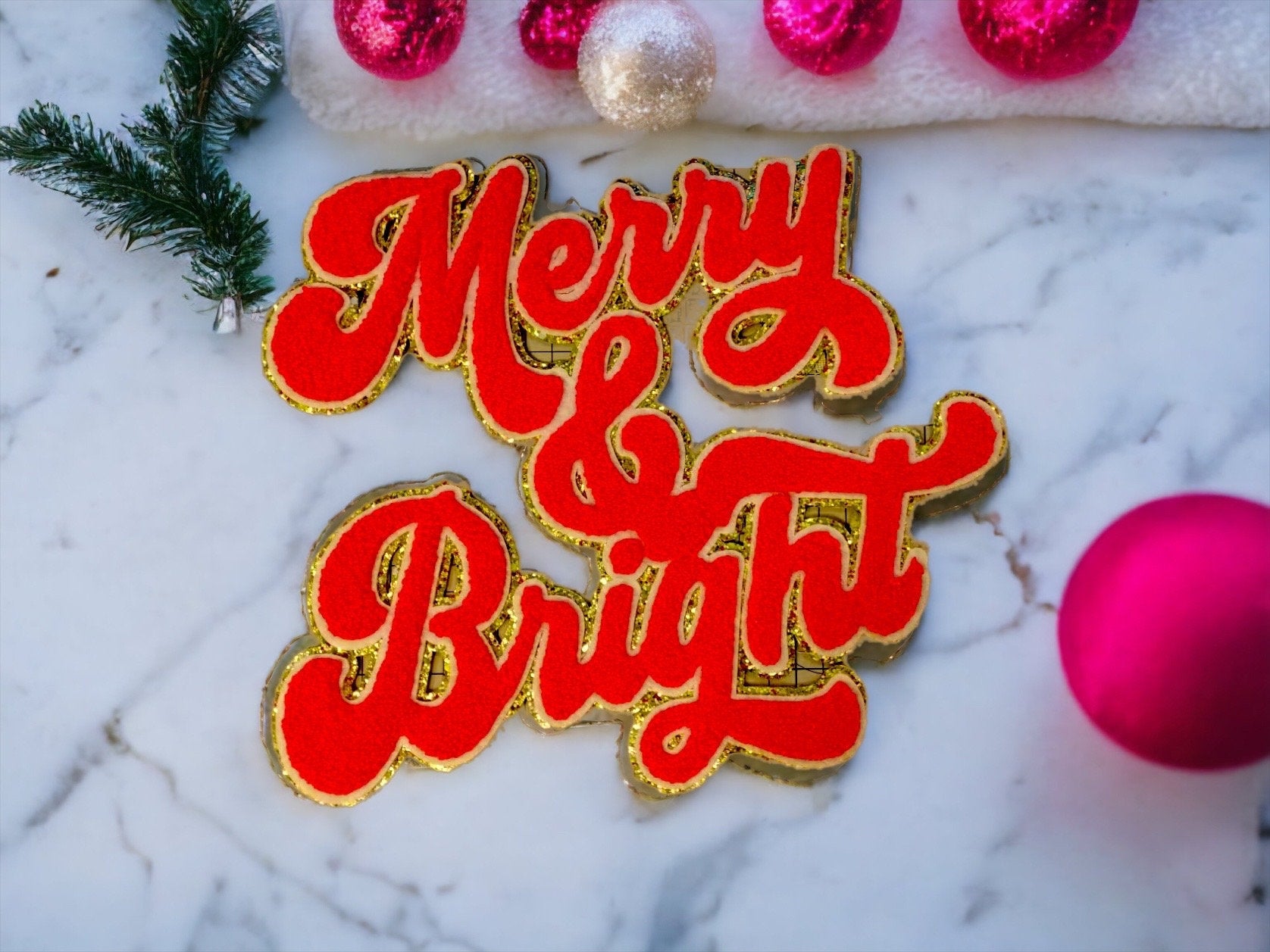 Merry & Bright- Iron On Patch- Red Chenille Holiday Sweatshirt - Fuzzy Chenille Patch Alphabet Patch Glitter Christmas patch-Patch Only DIY