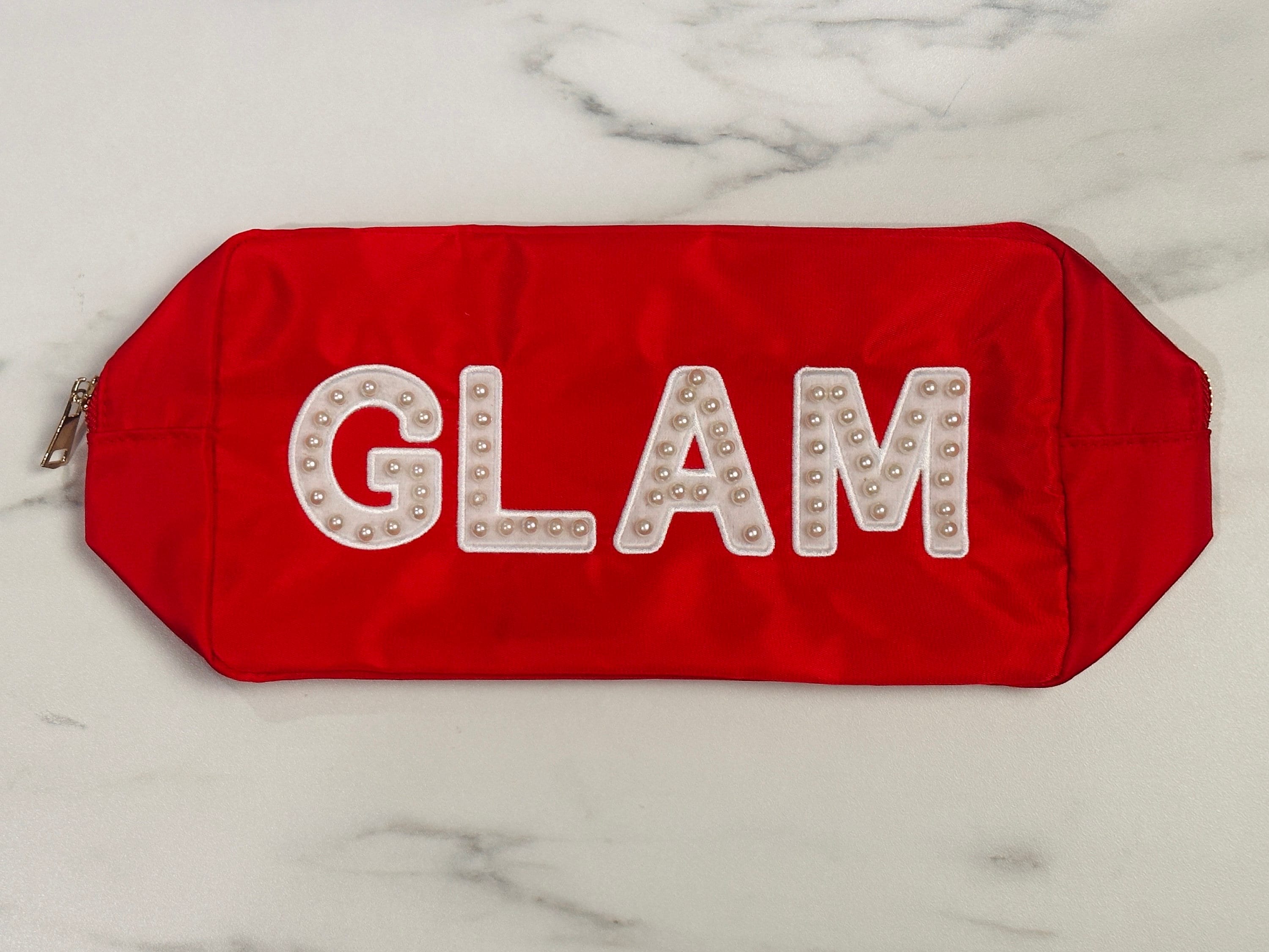 Glam Nylon Bag Pouch - Sewn On Pearl Varsity Letter Initial Patches make up travel Bag- - Red Christmas gift