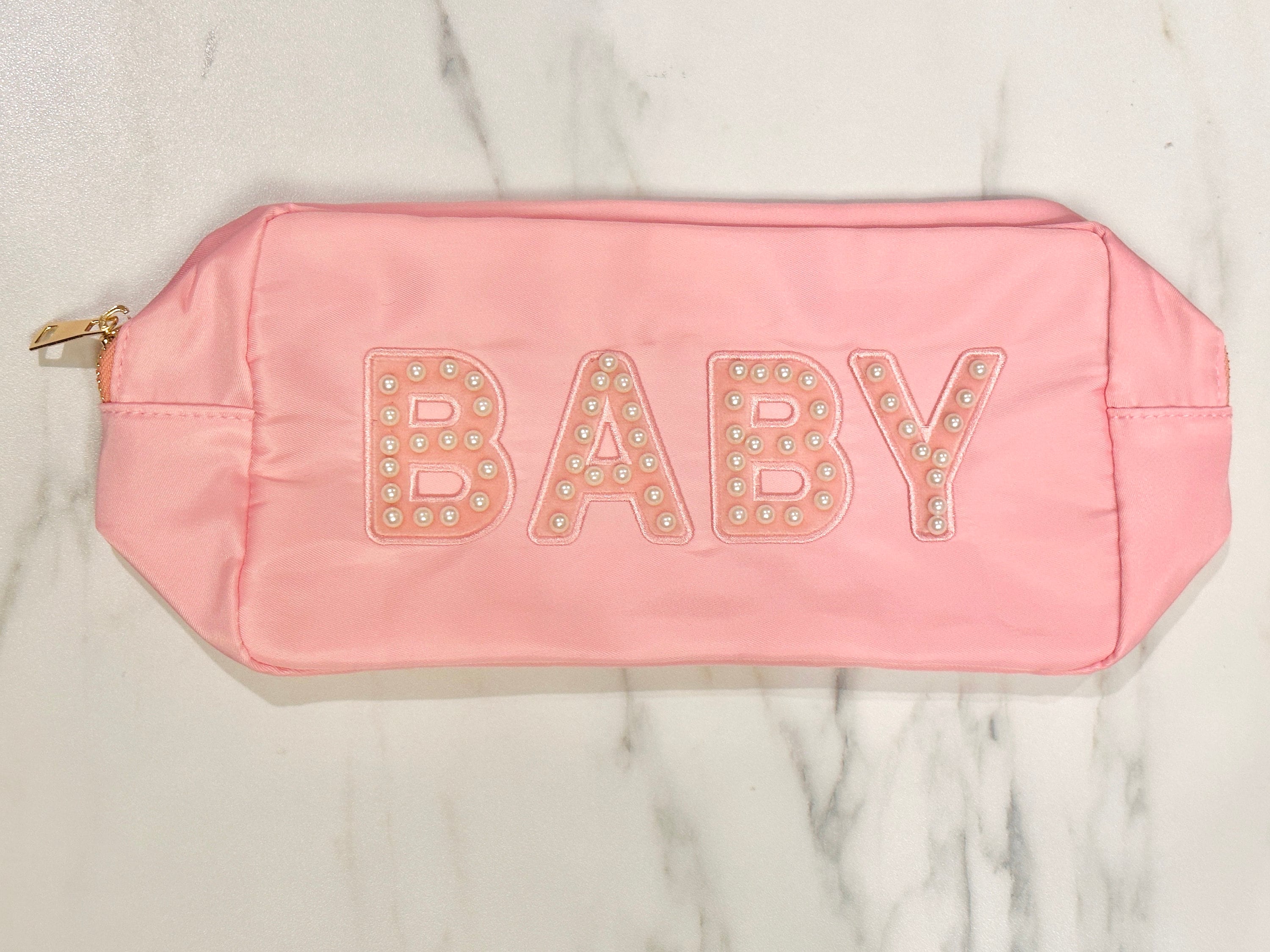 Baby Nylon Bag Pouch - Sewn On Pearl Varsity Letter Initial Patches Makeup Bag- - Baby Pink Girl Gift