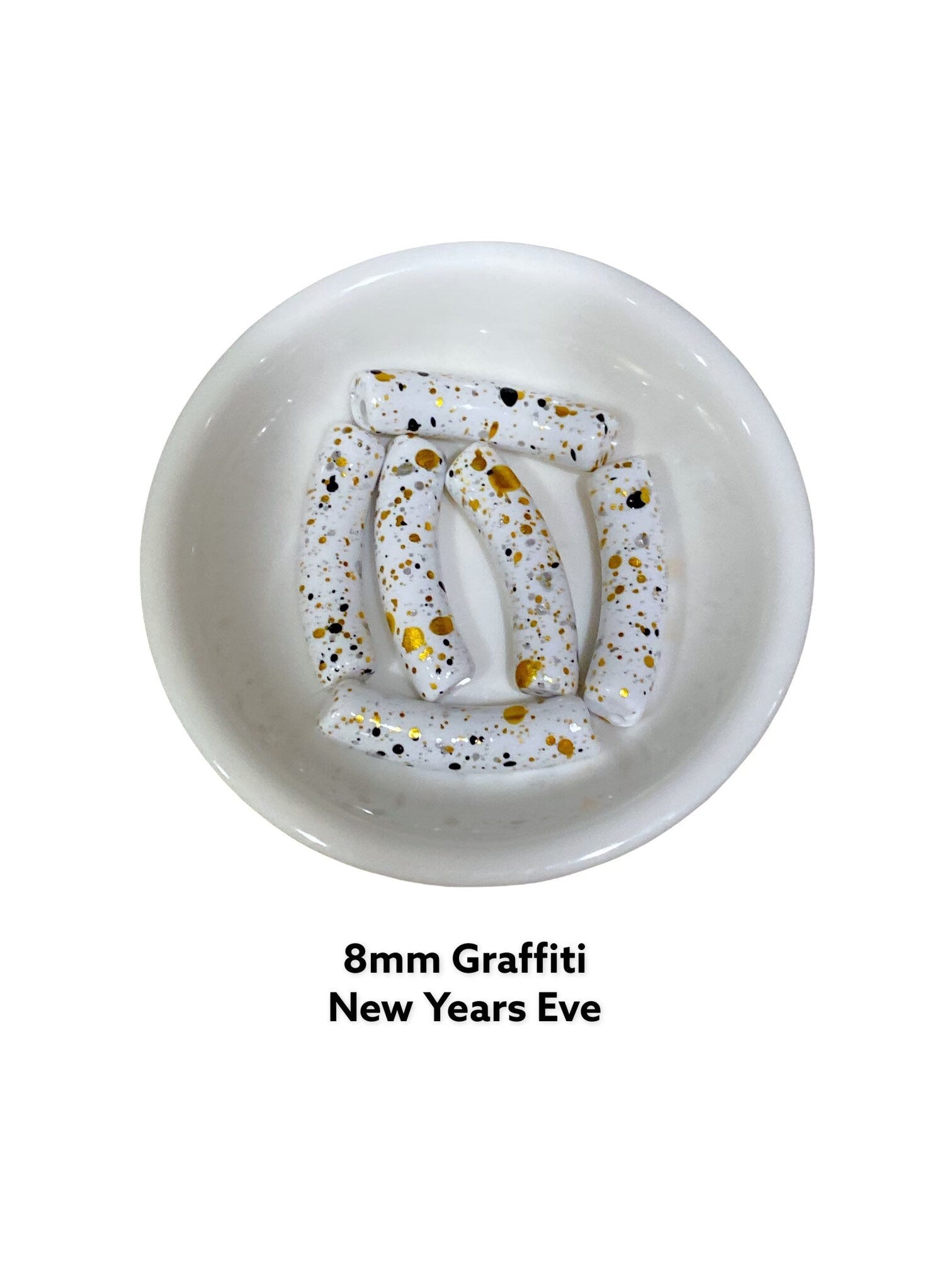 8mm Holiday Graffiti- New Years Eve Graffiti Paint Splatter Beads -Holiday Splatter Gold, Silver, Black Acrylic Tube Beads, Bamboo Beads