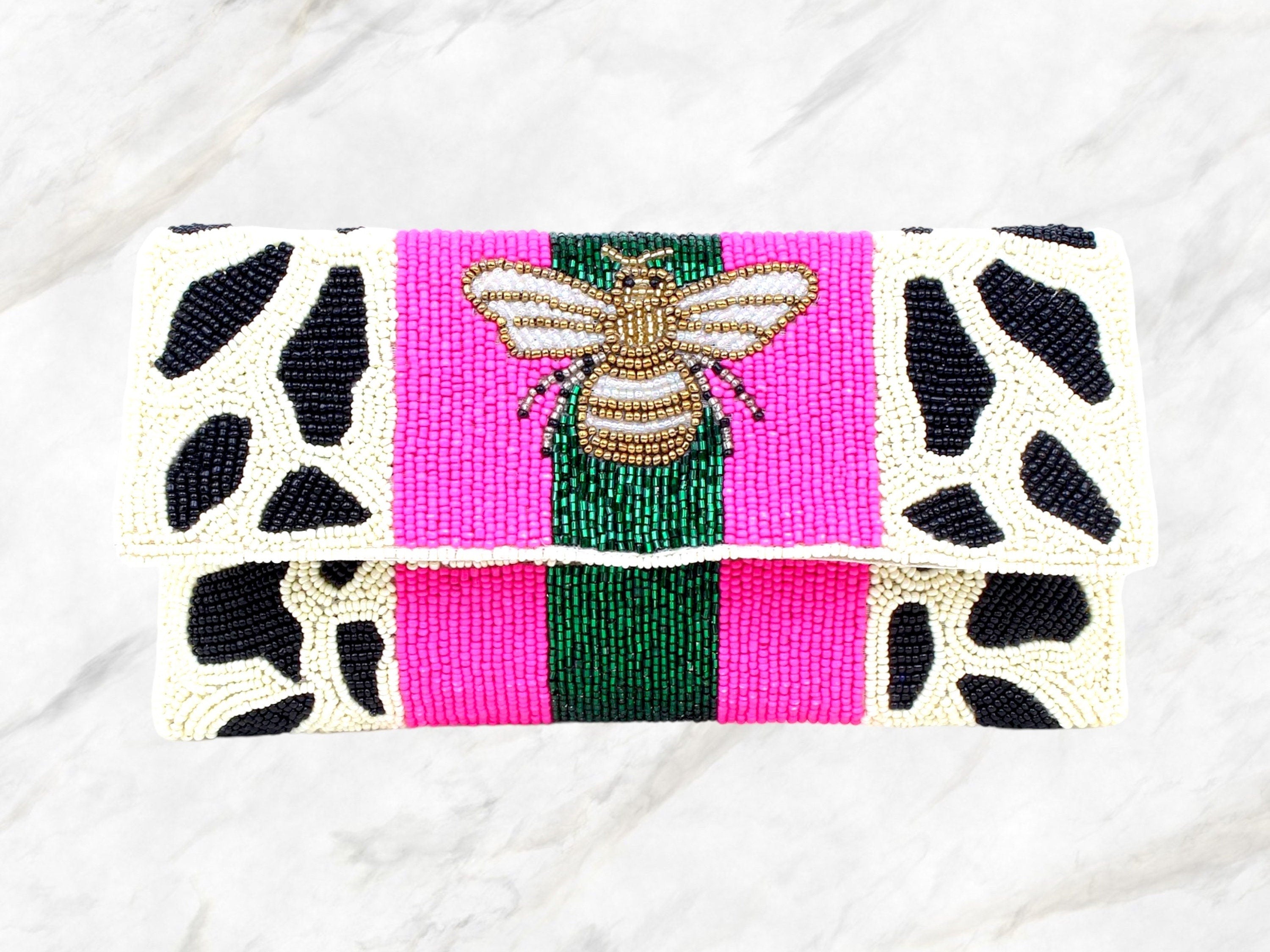 Royal Bee Clutch- Italian Striped bee hive Clutch, Handmade Beaded Crossbody Chain Clutch Bag Handbag, Red and green stripe, beaded
