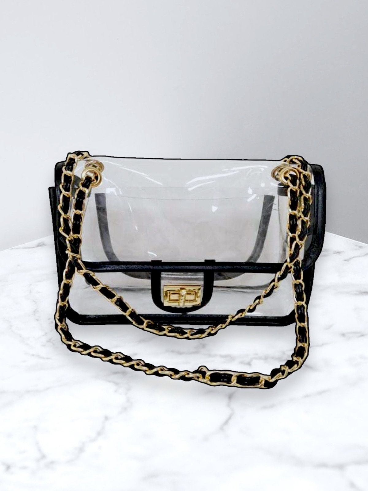 Whether you're heading to a live concert, thrilling sports event, or any gathering with security regulations, our Clear Stadium Bag with Designer Features and Gold Accents is the perfect companion. Make a statement without compromising on functionality - grab yours today and experience events in the epitome of style and ease.